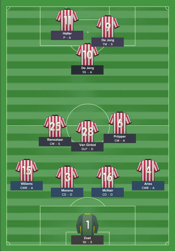 On 36 minutes Santiago Arias plays a long ball to Luuk de Jong, the Target Man heads it on for the run of Sebastian Haller but Haller isn’t quick enough or strong enough to make anything of it. He’s struggling again today.