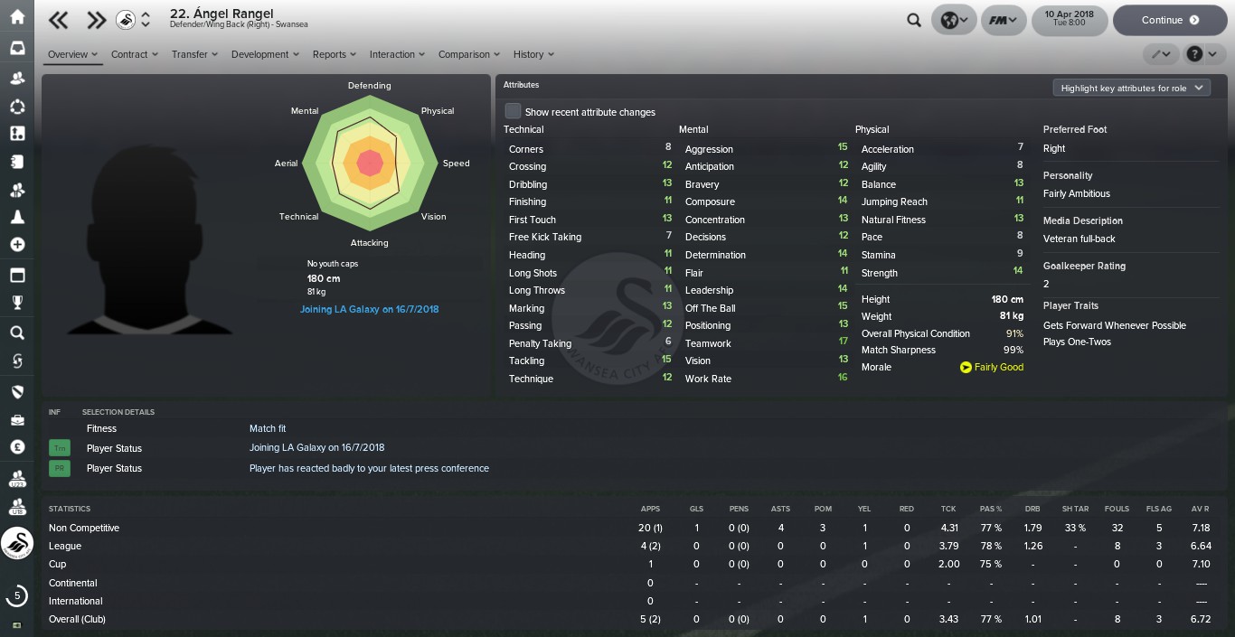 It is fitting that Rangel will complete his career over in America, where he can earn some serious wonga with the superstars of LA Galaxy. Even in digital form as an abstract construct of unfathomable binary code he deserves respect for the way he has seamlessly come in to cover for Kyle Naughton during his injury, it’s one of the many reasons why I chose not to stand in his way.